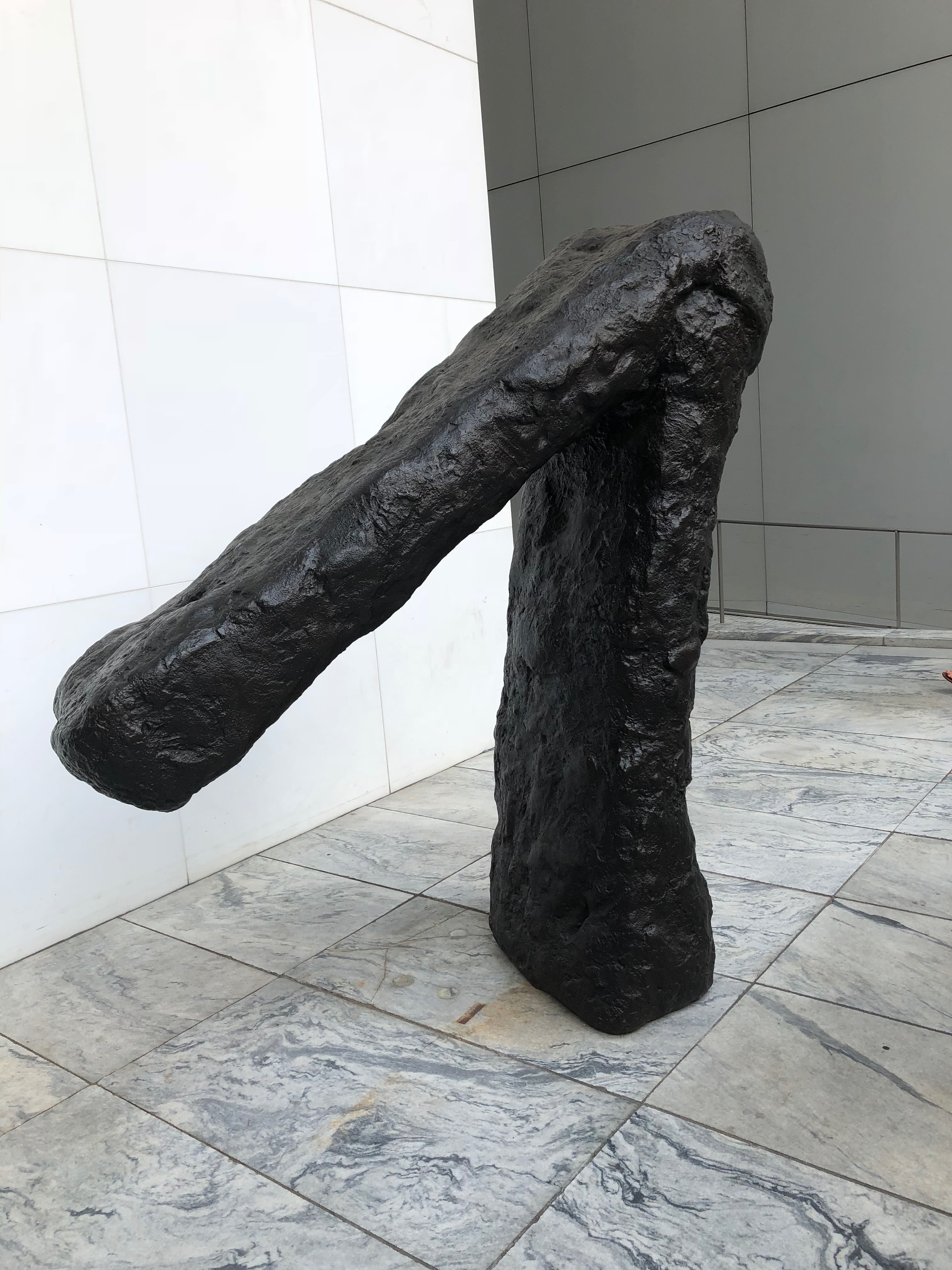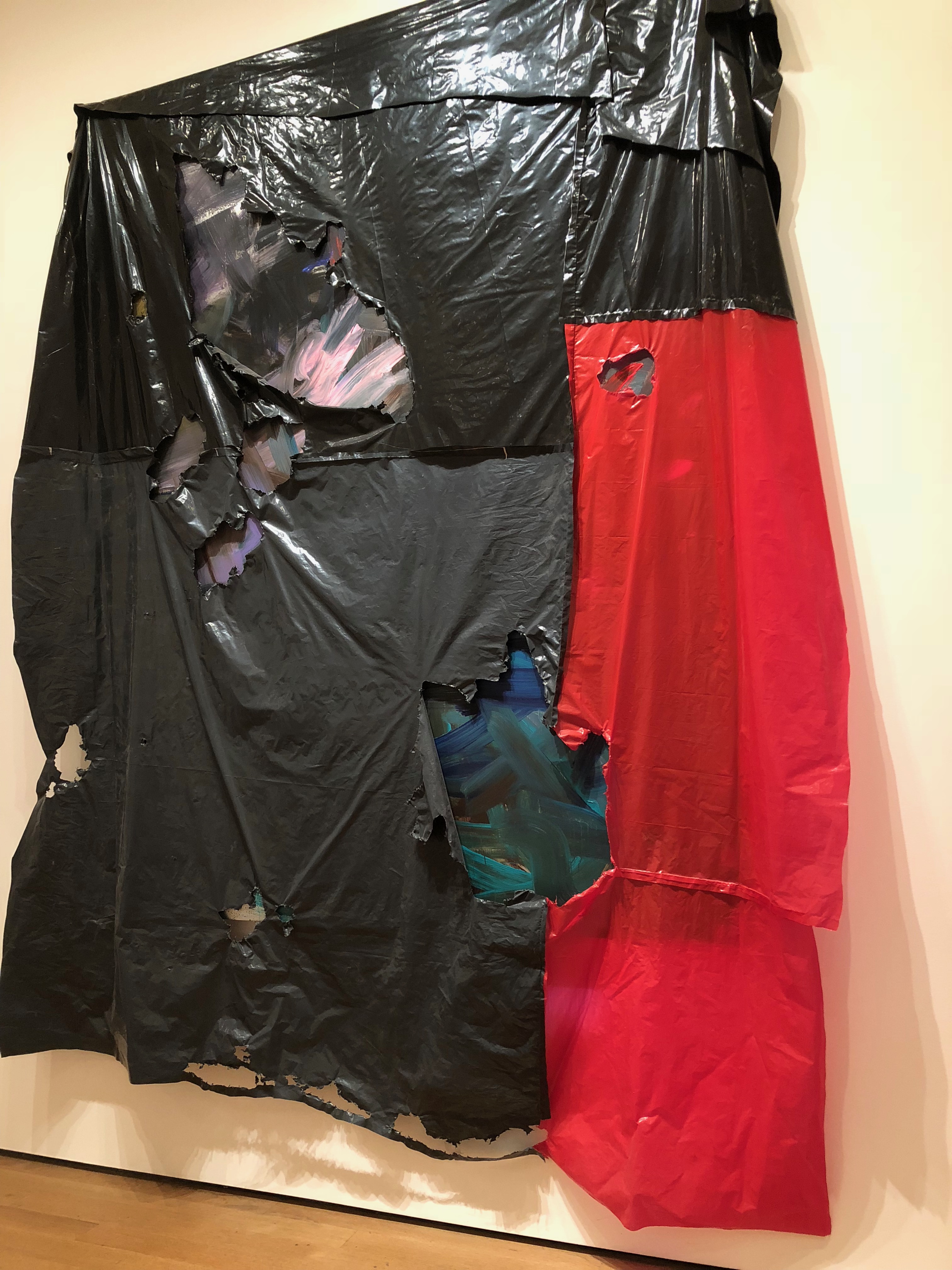 As you can see, like me, either the artist or the museum curator thought it was garbage. One of the more puzzling displays was enclosed in circular black curtains. Inside the curtained room was what looked like black bowling pins of various sizes hanging from wires. It reminded me of hanging salami in an Italian deli. There was no description or title of this “art.” I had a fleeting thought that maybe I wandered into a curtained off area that was under construction. To add to the ridiculousness, there was a uniformed security guard standing inside. I assume he was there in case someone had a burning desire to steal some black bowling pins (of various sizes).